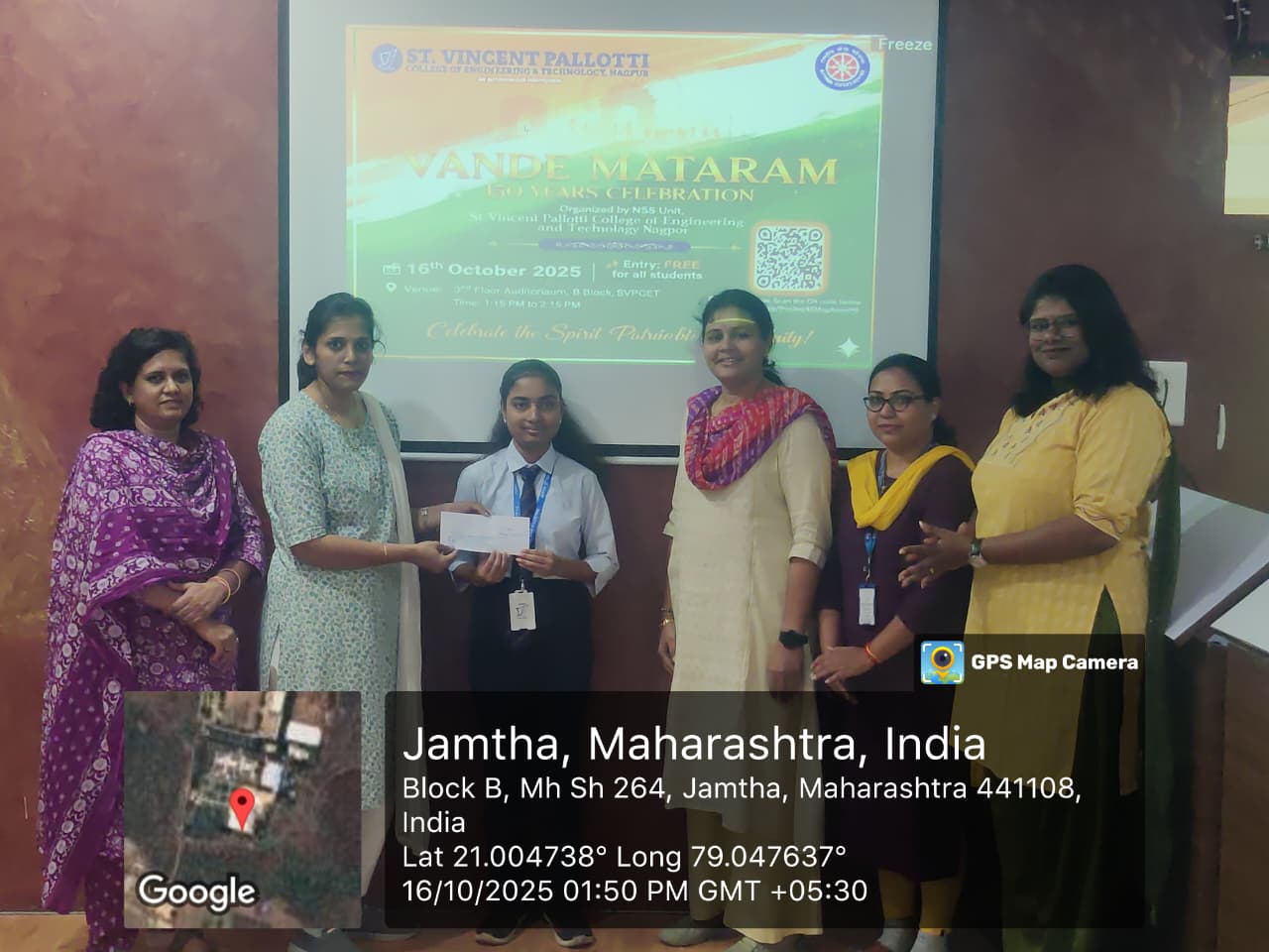 NSS Unit, St. Vincent Pallotti College of Engineering & Technology, Nagpur, organized a special program “Vande Mataram – 150 Years Celebration” on 16th October 2025 to commemorate 150 glorious years of India’s national song, Vande Mataram. The program was scheduled from 1:15 PM to 2:15 PM in the 3rd Floor Auditorium, B Block, SVPCET.