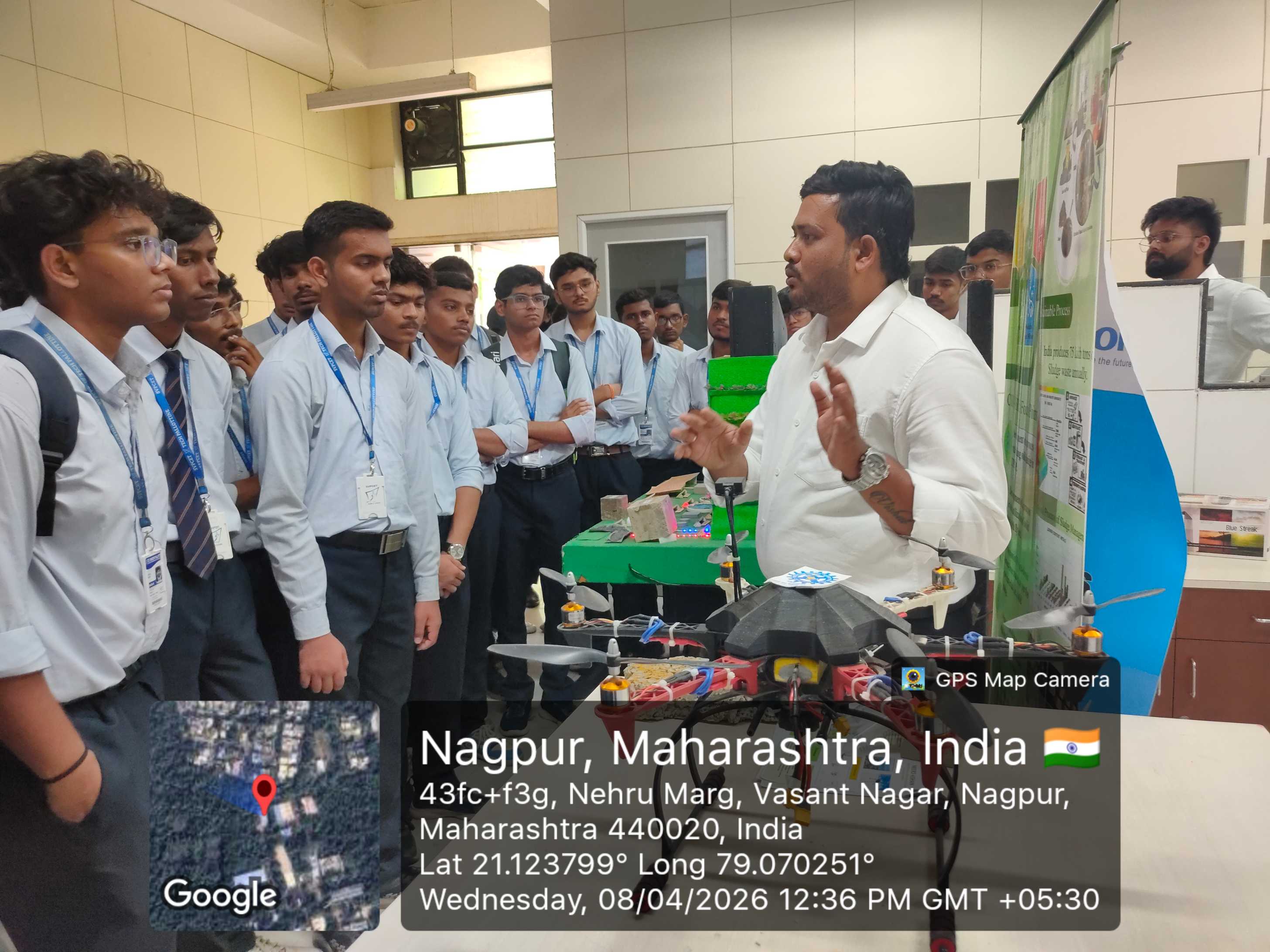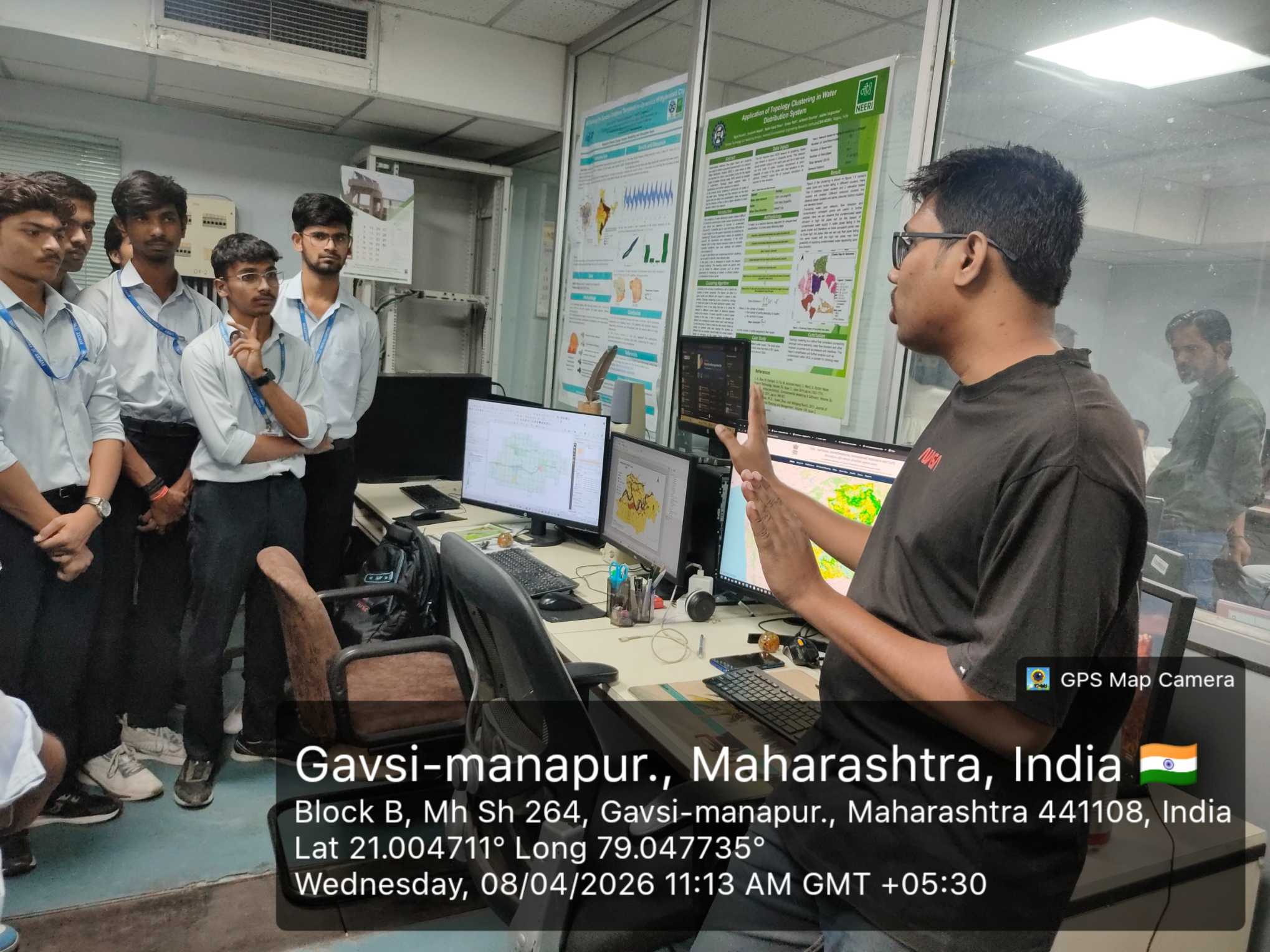 During the visit, students explored key projects such as the “Godavari River Document Project,” conducted in collaboration with IIT Hyderabad, focusing on pollution analysis and environmental impact. They were introduced to an AI-ML-based air pollution monitoring system using image processing and YOLO models to classify vehicles and estimate emissions, with technologies like Next.js, C++, and Python supporting its implementation. The air sampling technique using diffusion devices and filter paper was also demonstrated.