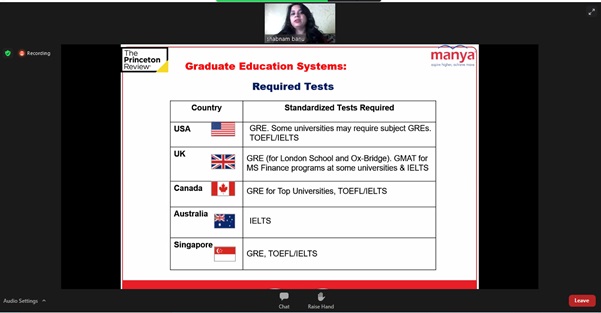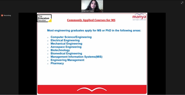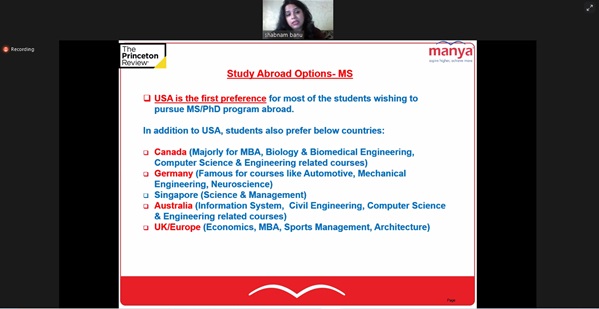 “The Career guidance cell”, Mechanical Engineering Department had recently arranged a webinar for 5th and 7th semester students, aspiring to study abroad. Ms. Shabnam Banu, National Admission Manager, Manya Education, Delhi presented and discussed in detail the relevance of Higher Education Abroad, Profile Enhancement Options, Test Preparation Requirements, Application Process, Stay Back Options & Post Study Work Rights, Common Mistakes to be Avoided and many more points related to studying abroad. In all, 56 students of the department attended the program and the session ended with questions and answers. The program was coordinated by Dr. Sushant S. Satputaley.