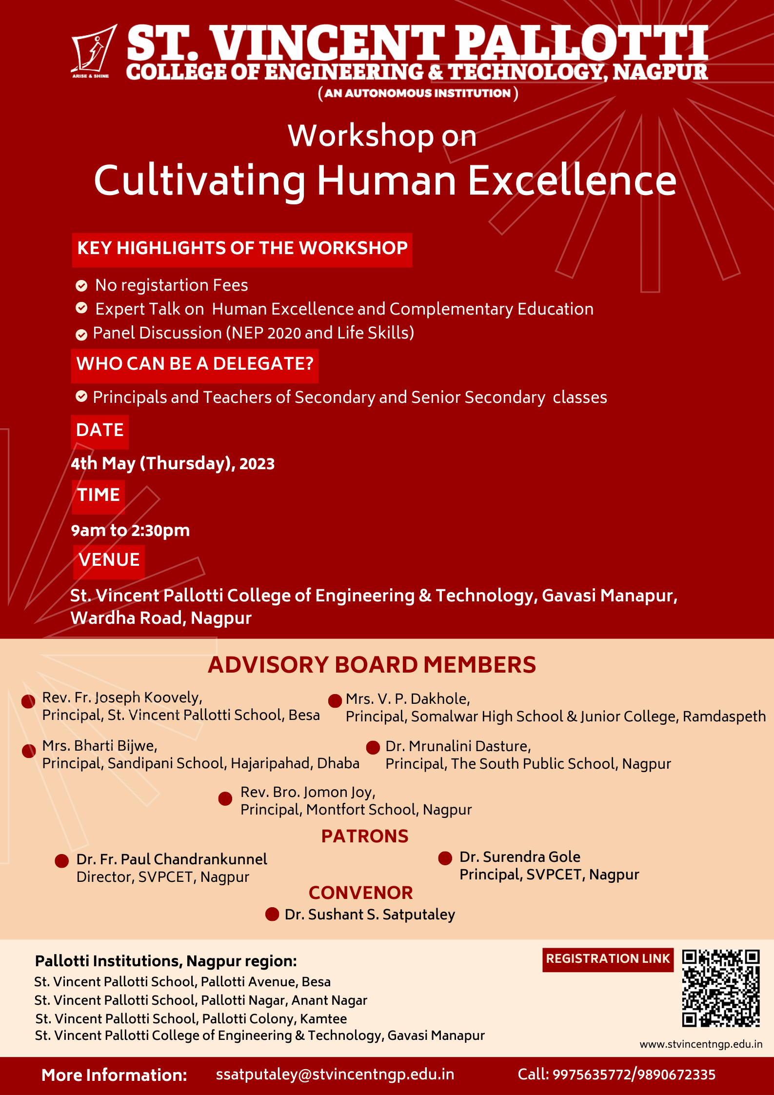ST. VINCENT PALLOTTI COLLEGE OF ENGINEERING & TECHNOLOGY (An Autonomous Institute) is organising ONE DAY WORKSHOP ON “Cultivating Human Excellence“ on 4th MAY (THURSDAY) 2023