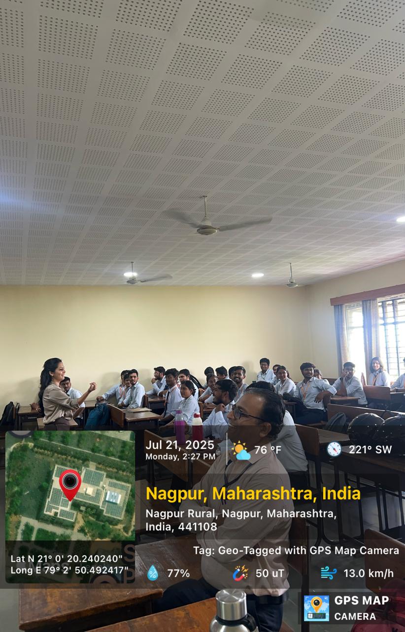 The Department of Mechanical Engineering, in collaboration with the Career Development Centre (CDC), organized a guest lecture on "Interview Techniques and Resume Writing" on July 21, 2025, from 2:15 PM to 4:15 PM in Room S-20, Block A, for 7th Semester Mechanical Engineering students. Coordinated by Prof. Pramodkumar Borle, the session was conducted by Ms. Sneha Taori, a renowned TEDx speaker, business coach, and corporate trainer from Nagpur.